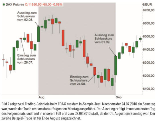 In Bild 2 sehen Sie außerdem einen zweiten Beispiel-Trade Ende August. Hier gingen wir erneut eine Long-Position zum 24. Kalendertag ein. Diese wurde am 01.09.2010 zum Schlusskurs wieder geschlossen.